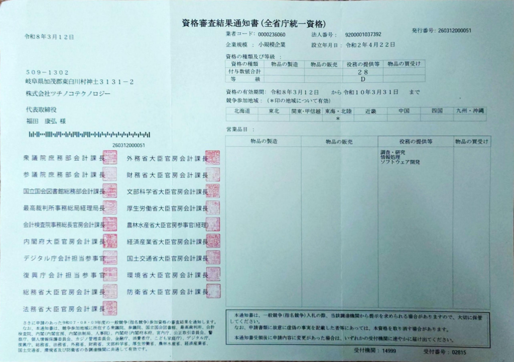 本資格の取得は、当社の事業運営が一定の基準を満たし、公共分野においてもお取引いただける体制が整ったことを示すものと受け止めております。